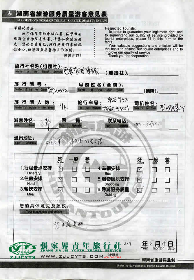 遼寧大連市“王小姐”與張家界青旅旅游顧問——在4月19日取得聯(lián)系,并與“大連保稅區(qū)金鑫石油公司”負(fù)責(zé)人武志紅女士(王靜為9名成員之一),就同行人員基本情況,做了深層次的在線溝通,在此過程中,雙方多次溝通最終在5月03日才確立《國內(nèi)旅游組團(tuán)接待合同》,并委托我社預(yù)訂往返聯(lián)程機(jī)票。并且確立由我社負(fù)責(zé)全程接待安排,并與之簽訂了接待服務(wù)協(xié)議;武女士一行9人一行于5月15日上午09:00點(diǎn)許飛抵長沙市,后在下午4點(diǎn)許中轉(zhuǎn)抵達(dá)張家界市,之后便開始了5天行程的走進(jìn)的美麗張家界之旅。 5月19日下午18:00結(jié)束行程,先赴北京,后自北京轉(zhuǎn)飛大連周水子機(jī)場(chǎng)