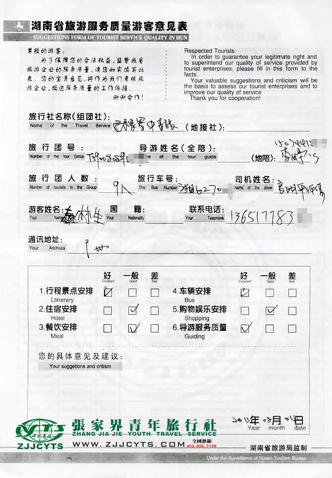 廣東廣州市“林先生”與張家界青旅旅游顧問——客服經理“張德建”先生在7月15取得聯(lián)系,并與其林先生就合理選擇的選擇行程、旅游過程的具體要求、服務范圍,做了多次在線溝通和電話溝通,經過細致的商磋,最終在07月23日確立并簽訂《國內旅游組團接待合同》,正式確立由我社負責全程接待安排;林先生親率貴賓一行9人,于07月30日下午抵達長沙,并安安排導游在長沙高鐵南站接站,搭乘我司提供商務豐田車,于當日下午三點許抵達張家界,次日便開始了為期3天行程的走進張家界之旅。 08月04日下午送團長沙后,貴賓搭乘高鐵返程回廣州