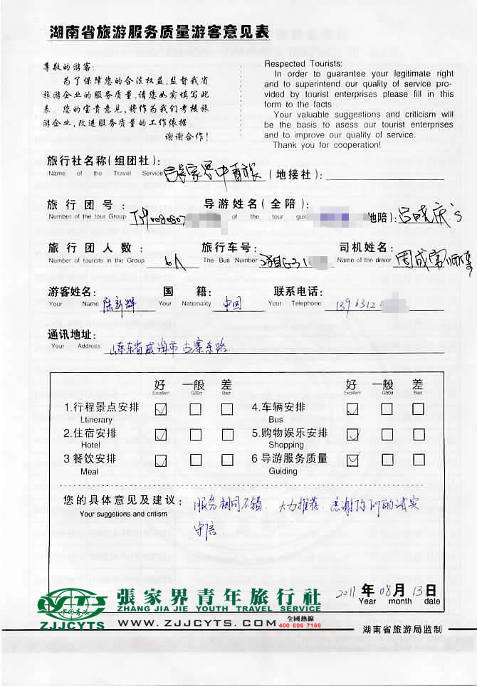 山東威海市“陸先生”與張家界青旅旅游顧問——客服“谷盈”在7月21取得聯(lián)系,并與負(fù)責(zé)此次旅行活動(dòng)的主要聯(lián)系人“陸先生”,就合理的選擇旅游線路、旅游過程的具體要求、服務(wù)范圍、住宿的安排,做了多次在線溝通和電話溝通,經(jīng)過細(xì)致的商磋,最終在07月31日正式簽訂《國內(nèi)旅游組團(tuán)接待合同》,由我社負(fù)責(zé)全程接待安排;08月08日陸先生親率貴賓一行6人抵達(dá)長(zhǎng)沙參加一個(gè)座談會(huì)議之后,于08月11日在我司長(zhǎng)沙分公司工作人員的協(xié)助之下,搭乘城際大巴于當(dāng)日下午13時(shí)間許抵達(dá)張家界,我社導(dǎo)游和司機(jī)迎接站,當(dāng)日便開始了為期3天行程的走進(jìn)張家界之旅。 08月13日下午送團(tuán),貴賓搭乘城市大巴車返程回長(zhǎng)沙,后中轉(zhuǎn)返程。