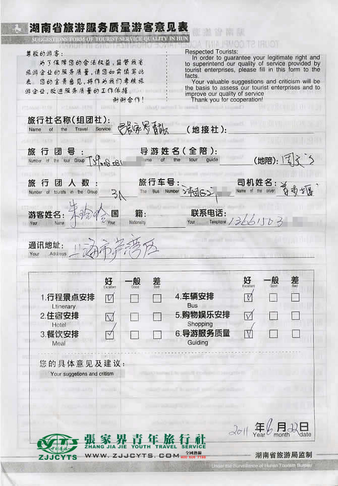 上海盧灣區(qū)“朱小姐”與張家界青旅旅游顧問——客服“卓東來”在08月12日得聯(lián)系,并就線路、行程的合理選擇、旅游景點的選定,以及服務(wù)的具體要求、范圍,做了多次在線溝通和電話溝通,經(jīng)過細(xì)致的商磋,最終在08月14日雙方簽訂了《國內(nèi)旅游組團接待合同》,并正式確立由我社負(fù)責(zé)全程接待安排;朱小姐一行3人(隨行成員中有1名位滿70歲老人),于08月18午乘坐K533次空調(diào)特快,于次日8月19午7:00許抵達張家界火車站,我社導(dǎo)游和司機前往迎接站,當(dāng)日便開始了為期4天行程的走進魅力湘西之旅。 08月22日下午12點鐘自鳳凰古城返程張家界,搭乘K1374次返程。