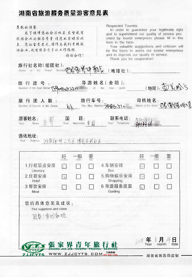 河南鄭州市“李先生”與張家界青旅旅游顧問——客服“田秋萍”在08月15日得聯(lián)系,并就線路、行程的合理選擇、旅游景點(diǎn)的選定,以及服務(wù)的具體要求、范圍,做了多次在線溝通和電話溝通,經(jīng)過細(xì)致的商磋,最終在08月15日雙方簽訂了《國(guó)內(nèi)旅游組團(tuán)接待合同》,并正式確立由我社負(fù)責(zé)全程接待安排;李先生一行6人貴賓于08月21乘坐1645次,于次日8月22上午7:00許抵達(dá)張家界火車站,我社導(dǎo)游和司機(jī)前往迎接站,當(dāng)日便開始了為期3天行程的走進(jìn)張家界山水之旅。 08月24日下午18點(diǎn)結(jié)束行程,搭乘K968次返程。
