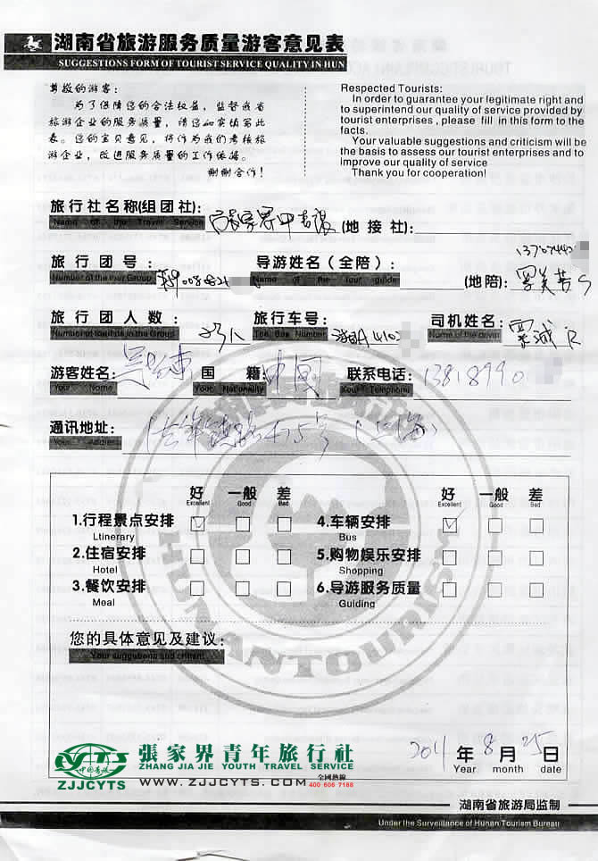 上海長寧區(qū)“吳先生”與張家界青旅旅游顧問——客服“卓東來”在08月14日取得聯(lián)系,并就線路、行程的合理選擇、旅游景點的選定,以及服務(wù)的具體要求、范圍,做了多次在線溝通和電話溝通,經(jīng)過細致的商磋,最終在08月17日雙方簽訂了《國內(nèi)旅游組團接待合同》,并正式確立由我社負責全程接待安排;吳先生一行23人貴賓于08月22上午乘坐K533次,于次日8月23上午7:00許抵達張家界火車站,我社導(dǎo)游和司機前往迎接站,當日便開始了為期3天行程的走進張家界山水之旅,08月25日下午18點結(jié)束行程,搭乘K1374次返程赴上海。