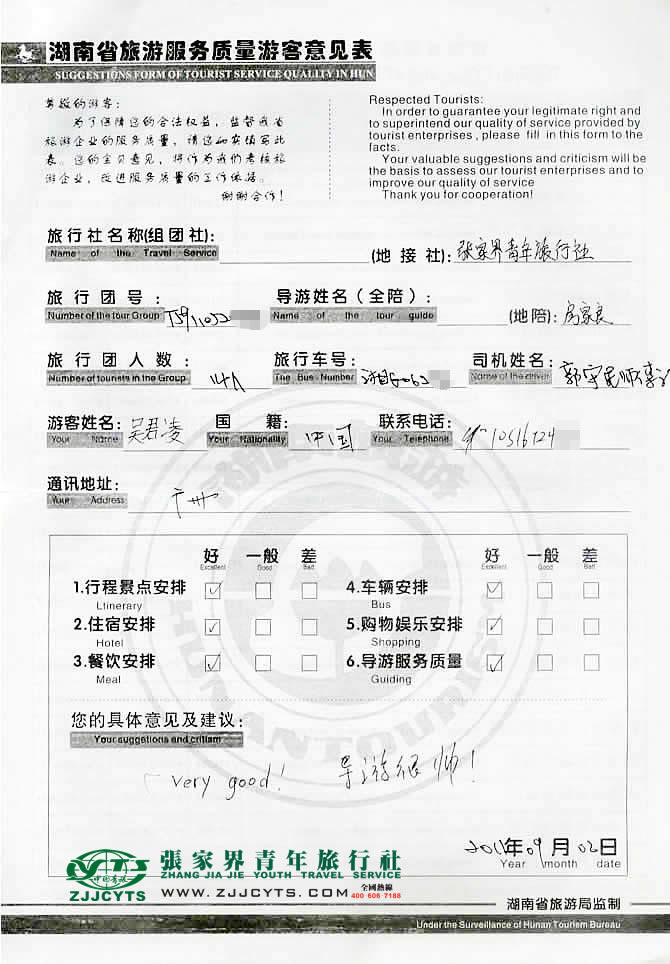 廣東廣州市“吳小姐”與張家界青旅旅游顧問——客服經(jīng)理“李朝陽”在08月22日取得聯(lián)系,并就線路、行程的合理選擇、旅游景點(diǎn)的選定,以及服務(wù)的具體要求、范圍與廣州晶爾曼首飾有限公司負(fù)責(zé)人吳女士,做了多次在線溝通和電話溝通,經(jīng)過仔細(xì)的商磋,最終在08月24日雙方簽訂了《國內(nèi)旅游組團(tuán)接待合同》,并正式確立由我社負(fù)責(zé)全程接待安排;吳總一行14人,于08月25上午自廣州搭乘CZ3385次航班飛抵張家界,當(dāng)日便開始了為期4天行程的魅力湘西之旅。