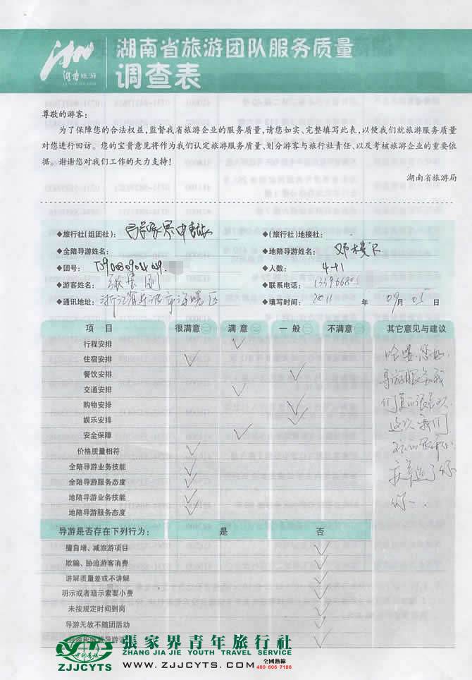 行程安排:滿意 車輛安排:滿意 住宿安排:滿意 導(dǎo)游安排:滿意 |