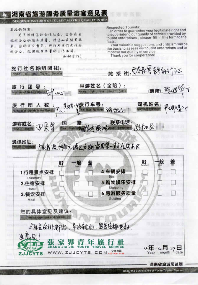 廣東深圳市“田先生”與張家界青旅旅游顧問——陳苑梅在2010年12月16日取得聯(lián)系,經(jīng)過3次的商談,雙方達(dá)成協(xié)議并簽訂了《國(guó)內(nèi)旅游組團(tuán)標(biāo)準(zhǔn)合同》,于12月23日下午抵達(dá)張家界,之后便開始了4天行程的張家界之旅。 此次行程是由我們優(yōu)秀導(dǎo)游——陳繼華,負(fù)責(zé)旅游接待工作,陳導(dǎo)在旅游過程中講解詳細(xì),服務(wù)周到,客人也很滿意。并給導(dǎo)游服務(wù)較高評(píng)價(jià)!