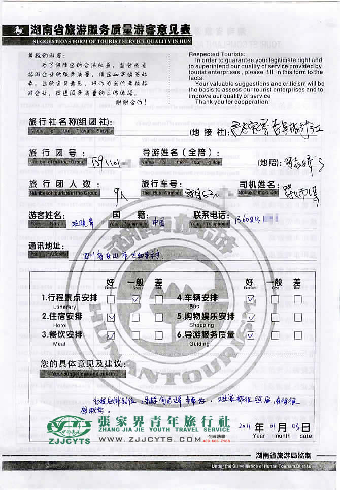 四川樂(lè)山市“項(xiàng)先生”與張家界青旅旅游顧問(wèn)——張家界青旅客服:張經(jīng)理在2010年12月22日取得聯(lián)系,經(jīng)過(guò)幾次的商談,雙方達(dá)成協(xié)議并簽訂了《國(guó)內(nèi)旅游組團(tuán)標(biāo)準(zhǔn)合同》,項(xiàng)先生一行9人于12月29日晚抵達(dá)張家界,之后便開始了5天行程的湘西探密之旅。 此次行程是由我們優(yōu)秀導(dǎo)游——何志嬌,負(fù)責(zé)旅游接待工作,何導(dǎo)在旅游過(guò)程中講解詳細(xì),服務(wù)周到,客人也很滿意。并給予導(dǎo)游服務(wù)“行程安排到位,非常好”的評(píng)價(jià)!