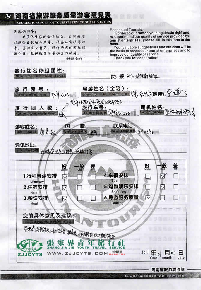 河北廊坊市“廖女士”與張家界青旅旅游顧問——蔣麗嬌在2010年12月24日取得聯(lián)系,經(jīng)過幾次的商談,雙方達(dá)成協(xié)議并簽訂了《國(guó)內(nèi)旅游組團(tuán)標(biāo)準(zhǔn)合同》,于12月31日下午抵達(dá)張家界,之后便開始了5天行程的湘西之旅。 此次行程是由我們優(yōu)秀導(dǎo)游——盧群,負(fù)責(zé)旅游接待工作,盧導(dǎo)在旅游過程中講解詳細(xì),服務(wù)周到,客人也很滿意。并給予導(dǎo)游服務(wù)好評(píng)價(jià)!