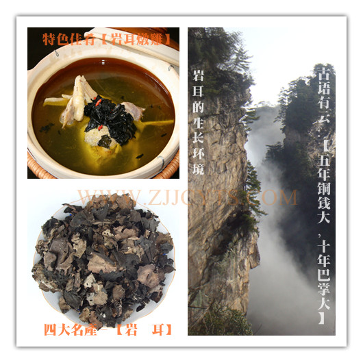 生长在岩壁上的黑色地衣植物,也是张家界景区的一大特产。岩耳一般生长在靠北朝南,岩壁湿润,属砂质岩的地方。它是一种菌类食品,营养丰富,可以入药。据李时珍《本草纲目》记载,石耳有滋补、消炎、降压的功能,可以“明目益精”,能延年益寿。石耳对脱肛病患者与肝癌症患者也有治疗作用。夏天吃石耳,不但能消炎,还能防酥。同时,岩耳又是一种营养价值较高的食品,煮熟后糯性较强,奇香可口;如果和肉作汤,则味道更美。在湘西北地区,岩耳还被用来防止食物变馊变腐。据说,炎夏季节,只要在新鲜的肉汤中扔几片岩耳,三五天后仍然味道鲜美。